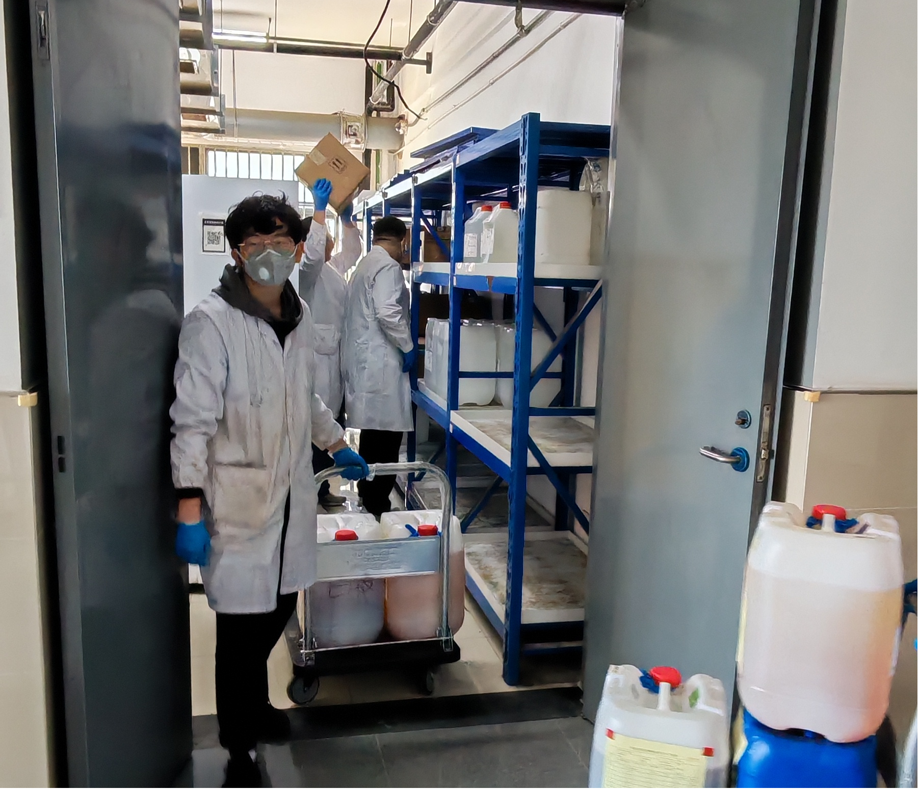 转运当日,老师提前统筹调度,反复确认转运时间、人员分工及路线规划,确保各环节无缝衔接;参与搬运的学生均做好规范防护,身穿实验服,佩戴防护手套,作业中相互配合协作,或合力轻抬危废箱体避免碰撞,或协助引导路线提醒行人避让,或配合核对台账信息,高效完成危废从暂存点到转运车的搬运工作。全程中,师生各司其职、紧密配合,1小时内安全完成所有危废装车。