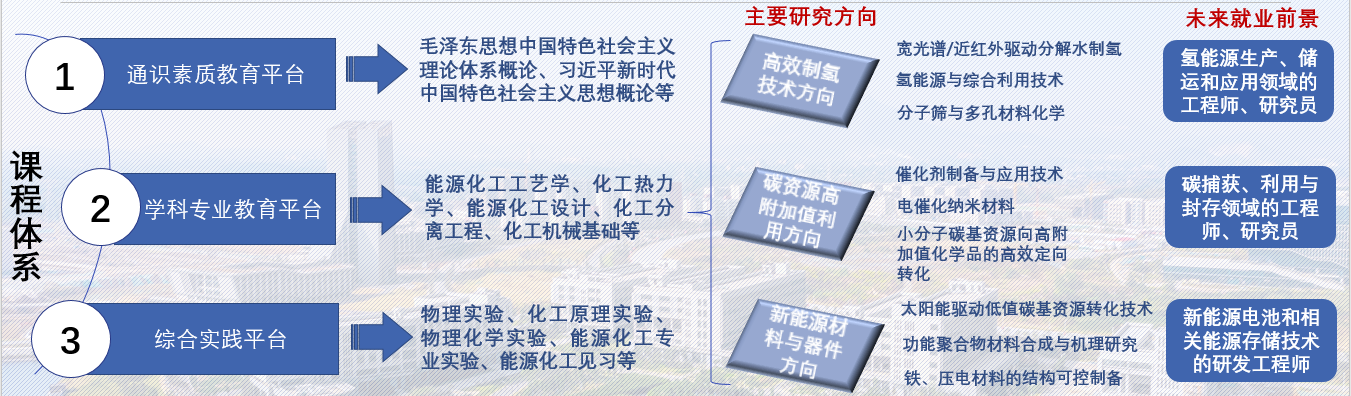 无机化学、分析化学、有机化学、物理化学、化工原理、化工热力学、能源化工概述、能源化工工艺学、能源化工设计基础、化学反应工程、化工节能与过程热集成、化工过程模拟、化工设备机械基础、海洋石油化学与炼制工艺、天然气水合物原理与技术、海洋可再生能源化工基础、海洋可再生能源催化技术等。