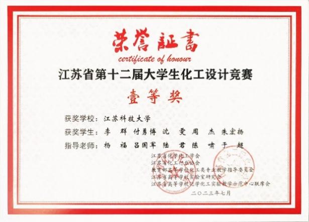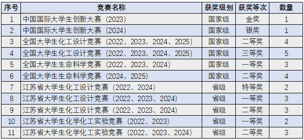 创新实践育英才:学生参与“本科生创新创业训练计划”覆盖率100%,近三年指导本科生获中国国际大学生创新大赛、全国大学生化工设计竞赛、江苏省大学生化学化工实验竞赛等国家级奖项18项,省部级奖项10余项,指导学生以第一作者身份发表论文20余篇。