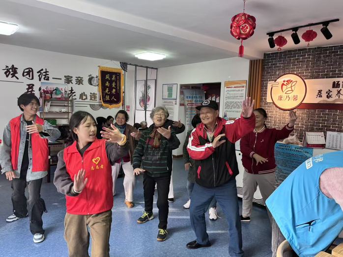 与此同时,杨家门社区居家养老服务中心内暖意融融。活动伊始,志愿者们为老人们送上亲手书写的祝福贺卡。字字真挚,句句含情,老人们眼角的笑意逐渐漾开,温暖了整个空间。随后的太极拳教学,将关怀融入行动。志愿者们将招式化繁为简,拆解为易于掌握的基础动作。伴随着舒缓的音乐,他们一边讲解太极舒筋活络的养生功效,一边穿梭于老人之间,轻声指导、耐心鼓励。老人们精神矍铄,一招一式虽显生涩,却透出生命的从容与活力,活动现场回响着整齐的脚步声与阵阵欢笑。